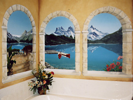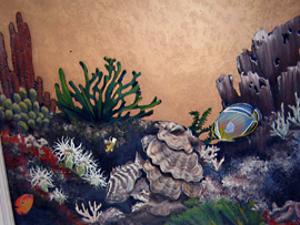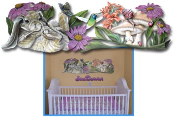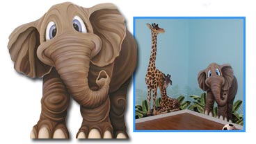 Our portable murals are jigsawed out of smooth and thin, yet strong fiberboard, painted, and then attached to your walls with industrial strength velcro. Below left, Tara is cutting out the detailed feathers of a bird. Below right, she is temporarily attaching a tree to the wall in preparation for painting. Creating our portable murals in our studio is more convenient for everyone!